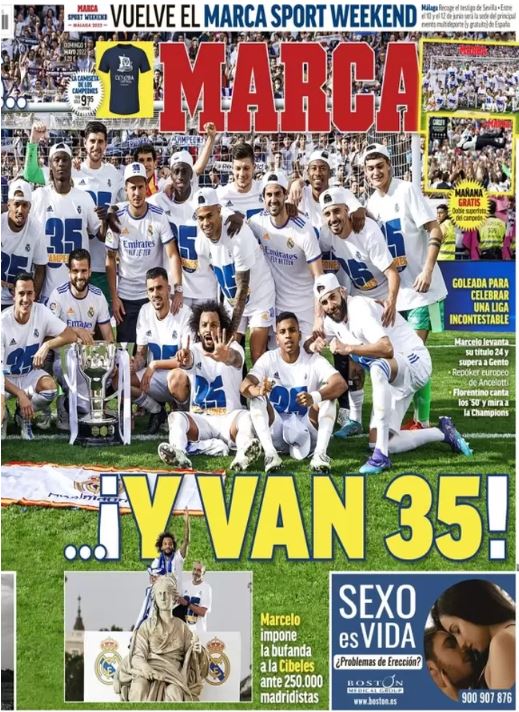 Marca dedica su portada a la conquista, por parte del Real Madrid, del Campeonato Español: "Goleada para celebrar una Liga incontestable. Marcelo levante su título 24 y supera a Gento. Repóker europeo de Ancelotti".