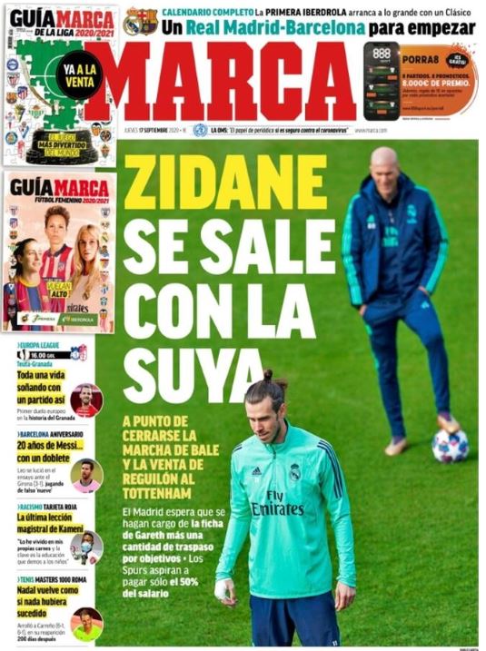 Marca destaca en su portada que está "a punto de cerrarse la marcha de Bale y la venta de Reguilón al Tottenham, el Madrid espera que se hagan cargo de la ficha de Gareth más una cantidad de traspaso por objetivos. Los "Spurs" aspiran a pagar sólo el 50 por ciento de la ficha".