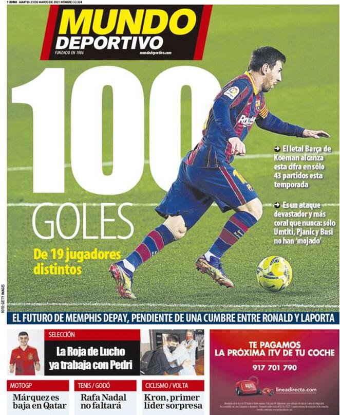 Mundo Deportivo destaca la variedad de caminos del FC Barcelona para convertir goles: "El letal Barça de Koeman alcanza los 100 goles en sólo 43 partidos esta temporada. Es un ataque devastador y más coral que nunca. Sólo Umtiti, Pjanic y Busquets no han mojado".