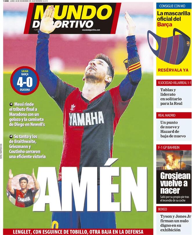 Mundo Deportivo publica en su portada que "Messi rinde tributo final a Maradona con un golazo y la camiseta de Diego en Newell's. Su tanto y los de Braithwaite, Griezmann y Coutinho cerraron una eficiente victoria".