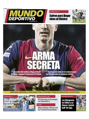 Mundo Deportivo publica que "Lewandowski acelera y llega al duelo de Milán, aunque Ferran será el 9 titular. El polaco es la bala en la recámara para un Flick que aún no recupera a Balde".