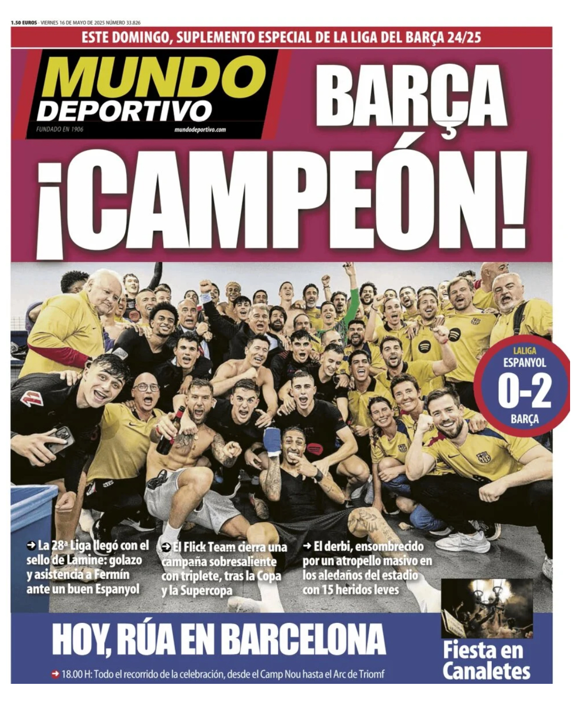 Mundo Deportivo apunta que "la 28ª Liga llegó con el sello de Lamine: golazo y asistencia a Fermín ante un buen Espanyol. El Flick Team cierra una campañma sobresaliente con triplete, tras la Copa y la Supercopa. El derbi, ensombrecido por un atropello masivo en los aledaños del estadio con 15 heridos leves".