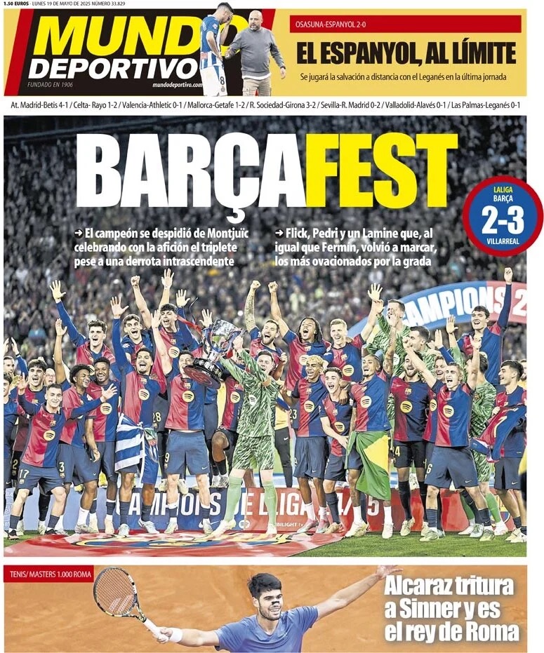 Mundo Deportivo apunta que "el campeón se despidió de Montjuïc celebrando con la afición el triplete pese a una derrota intrascendente. Flick, Pedri y un Lamine que, al igual que Fermín, volvió a marcar, los más ovacionados por la grada".