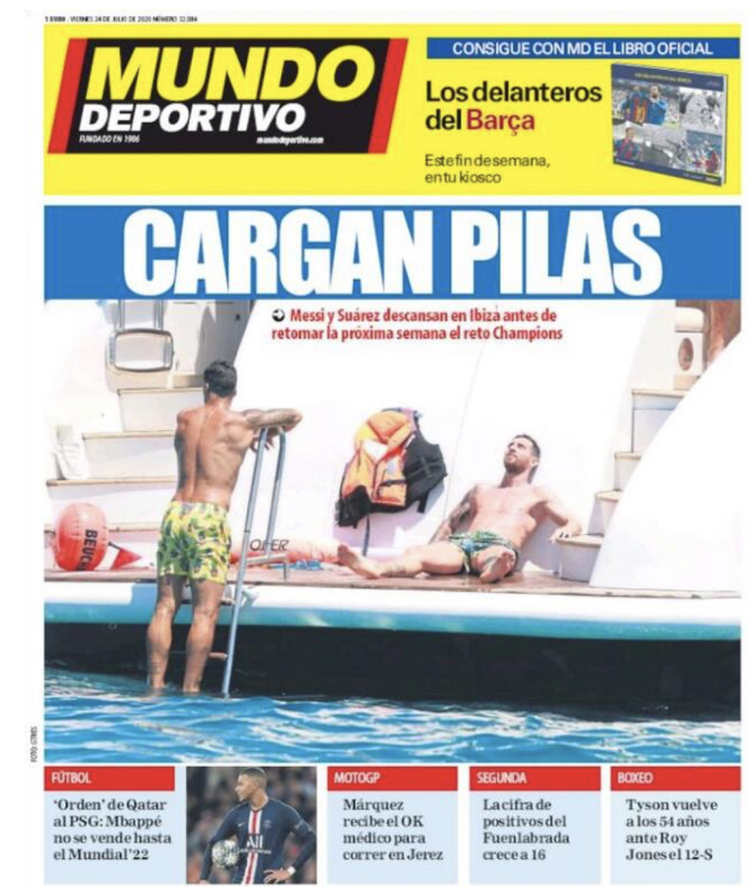 Mundo Deportivo dedica su portada al periodo de vacaciones de Luis Suárez y Lionel Messi... "Descansan en Ibizsa antes de retornar la próxima semana al reto Champions", apunta el diario catalán.