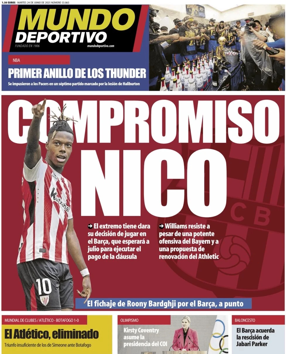 Mundo Deportivo apunta que Nico Williams "tiene clara su decisión de jugar en el Barça, que esperará a julio para ejecutar el pago de la cláusula. El jugador resiste a pesar de una potente ofensiva del Bayern y a una propuesta de renovación del Athletic".