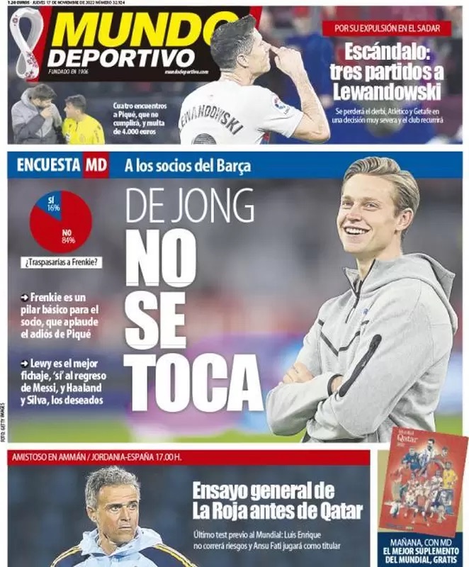 Mundo Deportivo publica los resultados de una encuesta a socios del FC Barcelona, que respaldan a Frenkie de Jong: "Es un pilar básico para el socio, que aplaude el adiós de Piqué. Lewandowski es el mejor fichaje, 'sí' al regreso de Messi y Haaland y Silva, los deseados".