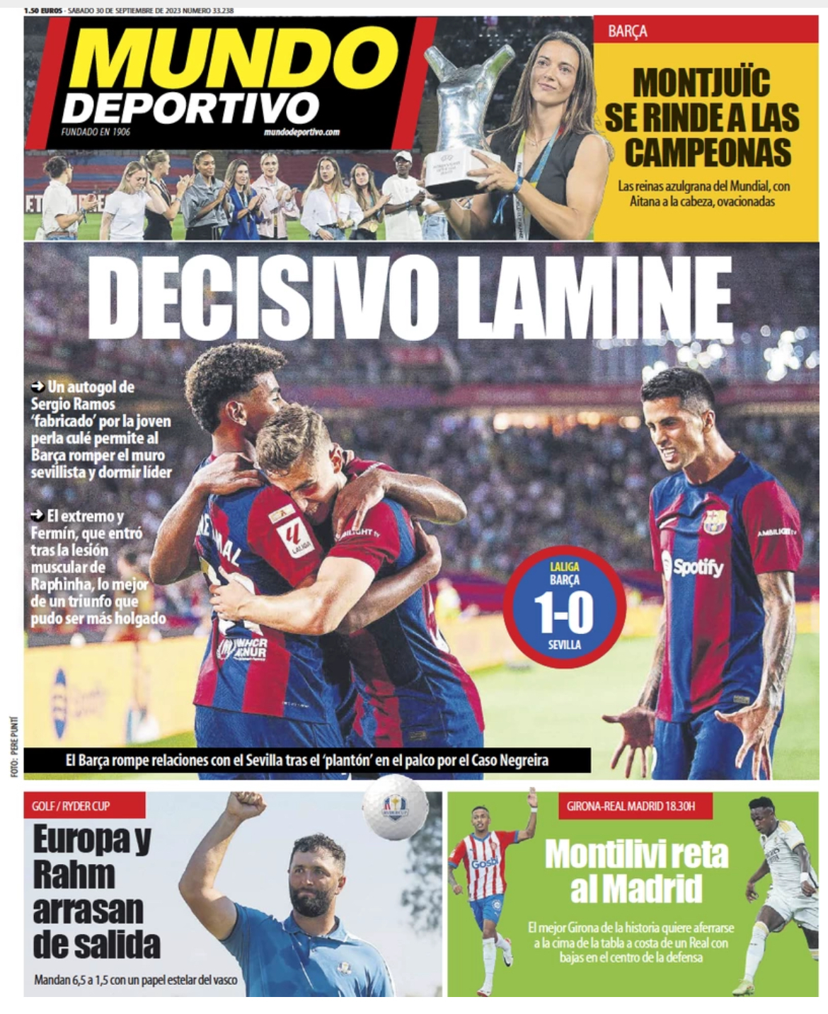 Mundo Deportivo apunta que "un autogol de Sergio Ramos 'fabricado' por Lamine Yamal permite al Barça romper el muro sevillista y dormir líder. El extremo y Fermín, que entró tras la lesión muscular de Raphinha, lo mejor de un triunfo que pudo ser más holgado".