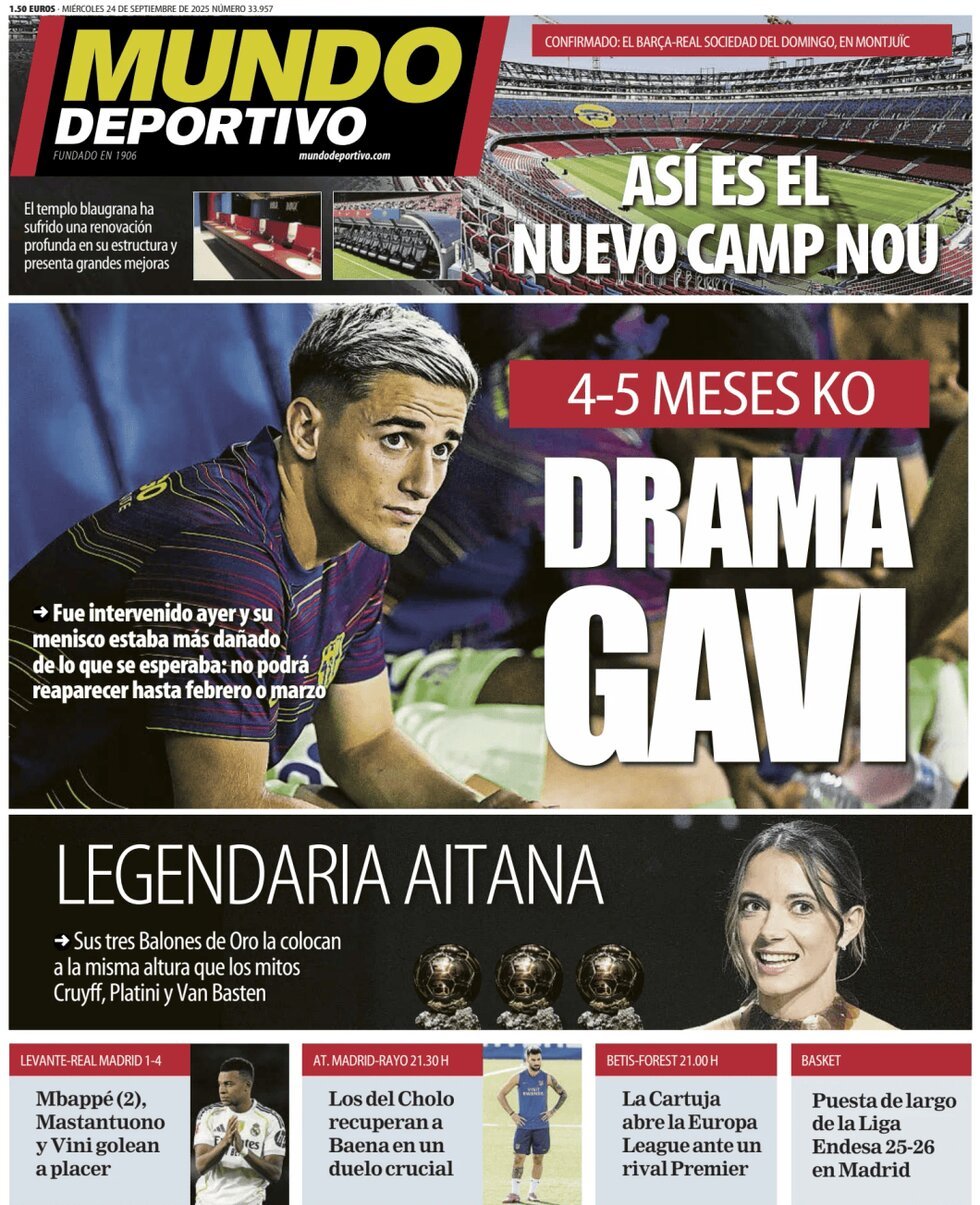 Mundo Deportivo apunta en su portada que Gavi "fue intervenido ayer y su menisco estaba más dañado de lo que se esperaba: no podrá reaparecer hasta febrero o marzo".