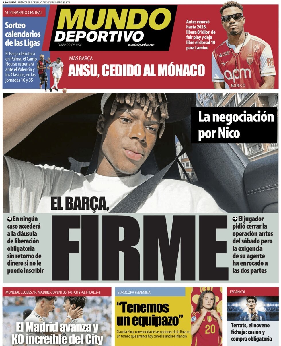 Mundo Deportivo apunta que "en ningún caso el Barça accederá a la cláusula de liberación obligatoria sin retorno de dinero si no le puede inscribir. Nico Williams pidió cerrar la operación antes del sábado pero la exigencia de su agente ha enrocado a las dos partes"