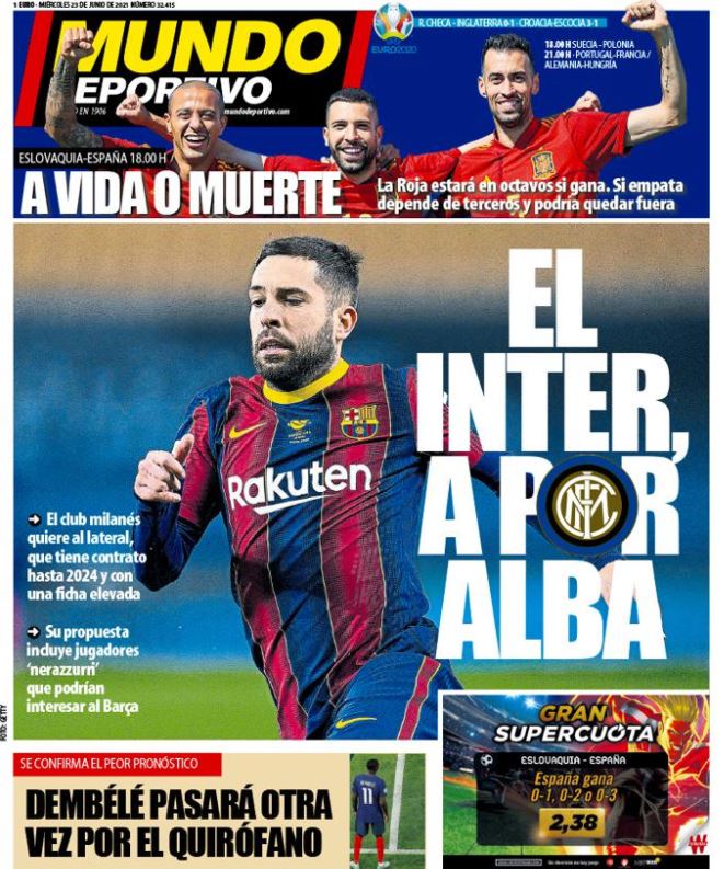 Mundo Deportivo apunta a un supuesto interés del Inter en Jordi Alba: "El club milanés quiere al lateral, que tiene contrato hasta 2024 y con una ficha elevada. Su propuesta incluye jugadores "nerazzurri" que podrían interesar al Barça".