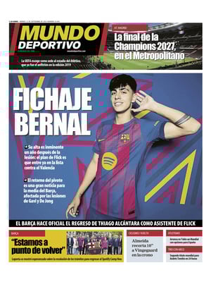 Mundo Deportivo apunta que el alta de Marc Bernal "es inminente un año después de la lesión: el plan de Flick es que entre ya en la lista contra el Valencia. El retorno del pivote es un gran noticia para la media del Barça, afectada por las lesiones de Gavi y De Jong".