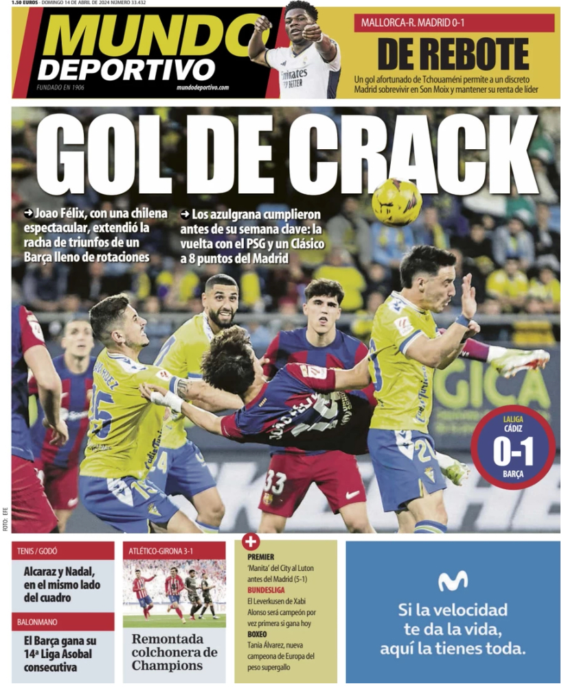 Mundo Deportivo apunta que "Joao Félix, con una chilena espectacular, extendió la racha de triunfos de un Barça lleno de rotaciones. Los azulgrana cumplieron antes de su semana clave: la vuelta con el PSG y un Clásico a 8 puntos del Madrid".