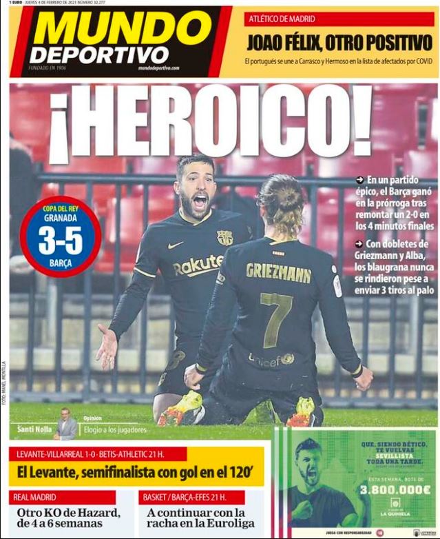 Mundo Deportivo resalta la remontada del FC Barcelona ante el Granada CF: "En un partido épico, el Barça ganó en la prórroga tras remontar un 2-0 en los 4 minutos finales. Con dobletes de Griezmann y Alba, los blaugrana nunca se rindieron pese a enviar 3 tiros al palo".