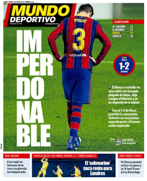 Mundo Deportivo publica que "el Barça se estrella en casa contra un Granada plagado de bajas, deja escapar el liderado y ya no depende de sí mismo. Tras el 1-0 de Messi, permitió la remontada visitante en una pésima segunda parte y Koeman acabó expulsado".