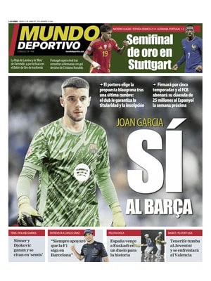 Mundo Deportivo apunta que Joan García "elige la propuesta blaugrana tras una última cumbre: el club le garantiza la titularidad y la inscripción. Firmará por cinco temporadas y el FC Barcelona abonará su cláusula de 25 millones al Espanyol la semana próxima".