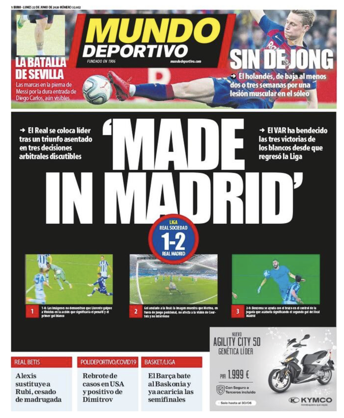 Mundo Deportivo carga en su portada contra el VAR aplicado en el Real Sociedad-Real Madrid: "El Real se coloca líder tras un triunfo asentado en tres decisiones arbitrales discutibles. El VAR ha bendecido las tres victorias de los blancos desde que regresó la Liga".