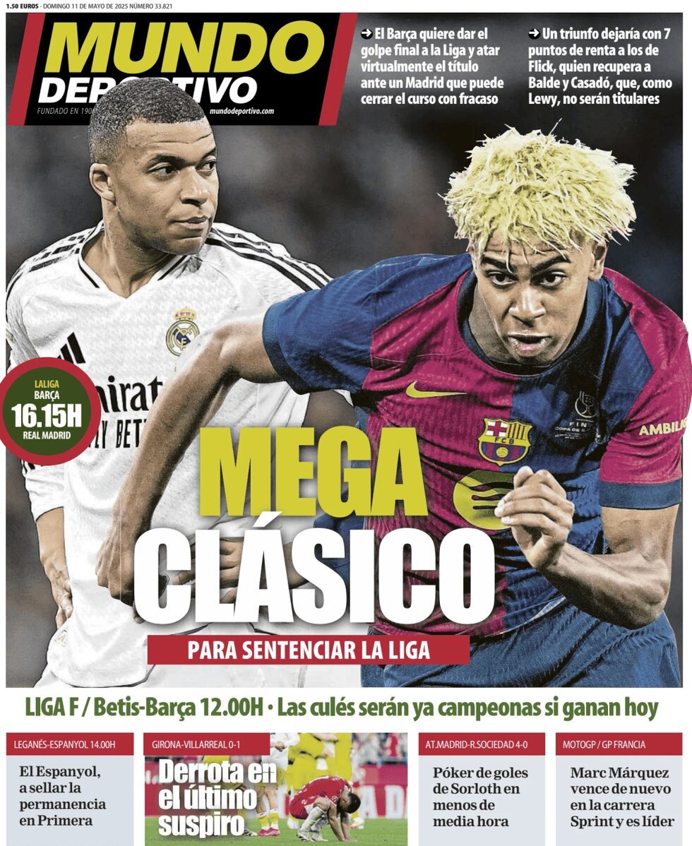 Mundo Deportivo apunta que "el Barça quiere dar el golpe final a la Liga y atar virtualmente el título ante un Madrid que puede cerrar el curso con fracaso. Un triunfo dejaría con 7 puntos de renta a los de Flick, quien recupera a Balde y Casadó, que como Lewandowski, no serán titulares".