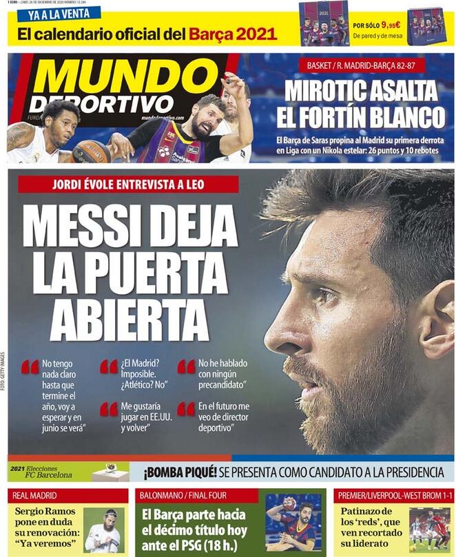Lionel Messi también es protagonista en la portada de Mundo Deportivo: "No tengo nada claro hasta que termine el año, voy a esperar y en junio se verá. No he hablado con ningún precandidato. Me gustaría jugar en Estados Unidos y volver", algunas de las frases destacadas.