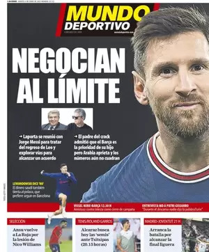 Mundo Deportivo publica que "Laporta se reunión con Jorge Messi para tratar del regreso de Leo y explorar vías para alcanzar un acuerdo. El padre del crack admitió que el Barça es la prioridad de su hijo pero Arabia aprieta y los números aún no cuadran"