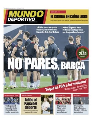 Mundo Deportivo apunta que "el líder busca tres puntos cruciales para encarrilar la Liga antes de la final de Copa. Flick, exigente: "Ante Dortmund y Celta ya vimos que debemos hacerlo mejor"".