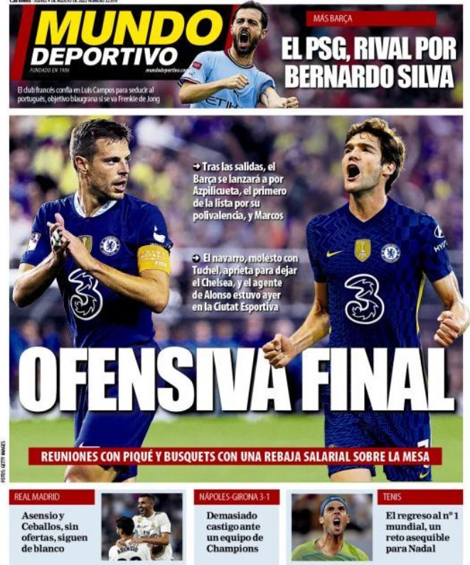 Mundo Deportivo apunta que "tras las salidas, el Barça se lanzará a por Azpilicueta, el primero de la lista por su polivalencia, y Marcos. El navarro, molesto con Tuchel, aprieta para dejar el Chelsea y el agente de Alonso estuvo ayer en al Ciutat Esportiva".
