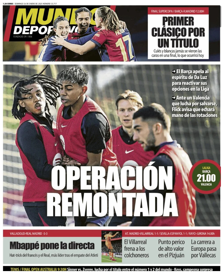 Mundo Deportivo apunta que "el Barça apela al espíritu de Da Luz para reactivar sus opciones en la Liga. Ante un valencia que lucha por salvarse, Flick avisa que echará mano de las rotaciones".