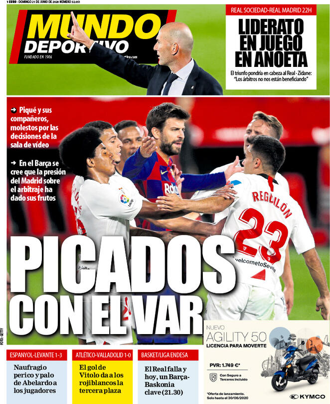 Mundo Deportivo pone el acento en el supuesto malestar de la plantilla del FC Barcelona por la aplicación del videoarbitraje: "Piqué y sus compañeros, molestos por las decisiones de la sala de video. En el Barça se cree que la presión del Madrid sobre el arbitraje ha dado sus frutos".