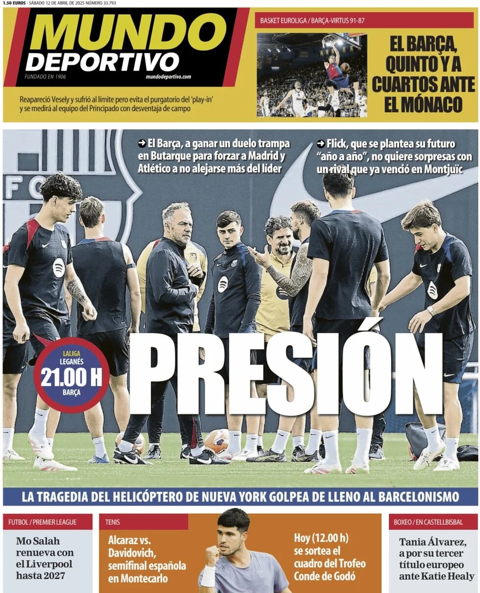 Mundo Deportivo dedica su portada al Leganés - Barcelona de esta noche: "El Barça, a ganar un duelo trampa en Butarque para forzar a Madrid y Atlético a no alejarse más del líder. Flick, que se plantea su futuro "año a año", no quiere sorpresas con un rival que ya venció en Montjuïc".