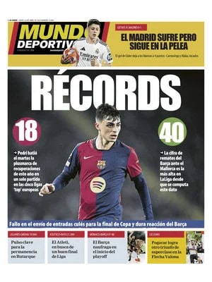 Mundo Deportivo publica que "Pedri batió el martes la plusmarca de recuperaciones de este año en un solo partido en las cinco Ligas 'top' europeas (18) y la cifra de remates del Barça ante el Mallorca (40) es la más alta en LaLiga desde que se computa este dato".