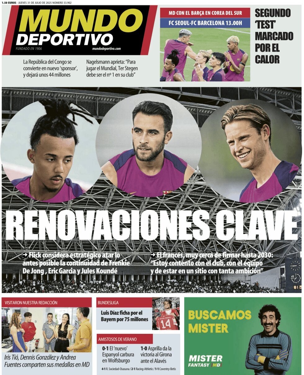 Mundo Deportivo apunta que ''Flick considera estratégico atar lo antes posible la continuidad de Frenkie de Jong, Eric Garcia y Jules Koundé. El francés, muy cerca de firmar hasta 2030''