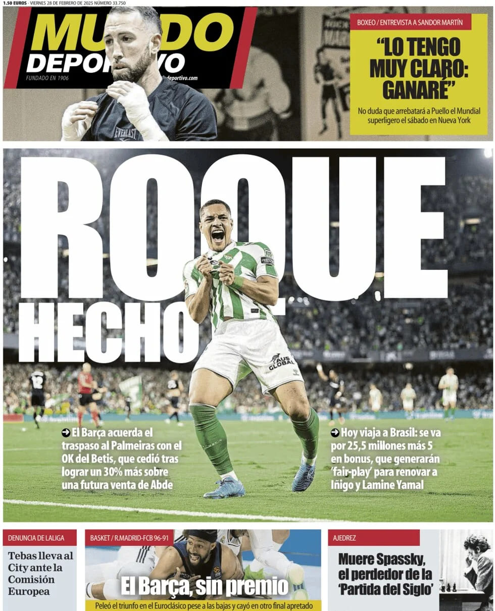 Mundo Deportivo publica que "el Barça acuerda el traspaso de Vítor Roque al Palmeiras con el OK del Betis, que cedió tras lograr un 30 por ciento más sobre una futura venta de Abde. Hoy viaja a Brasil: se va por 25,5 millones más 5 en bonus, que generarán 'fair play' para renovar a Iñigo y Lamine Yamal".