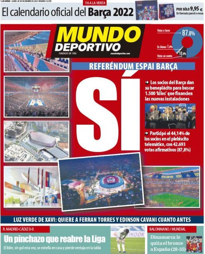 Mundo Deportivo dedica su portada a la aprobación de los socios del FC Barcelona a la negociación por parte de la Junta Directiva de un préstamo "de hasta 1.500 millones" para financiar el Espai Barça. .