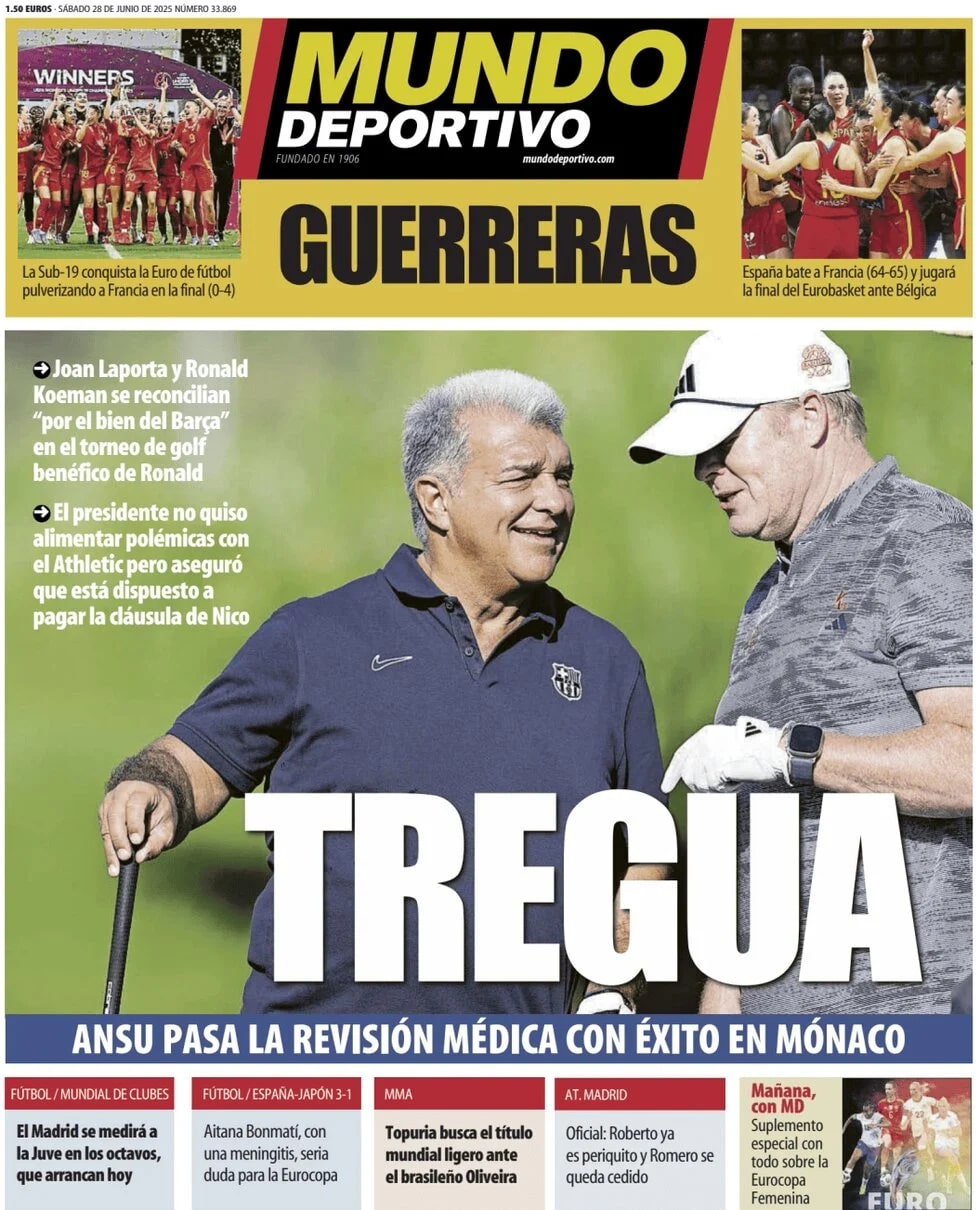 Mundo Deportivo apunta que "Joan Laporta y Ronald Koeman se reconcilian "por el bien del Barça" en el torneo de golf benéfico de Ronald. El presidente no quiso alimentar polémicas con el Athletic pero aseguró que está dispuesto a pagar la cláusula de Nico".