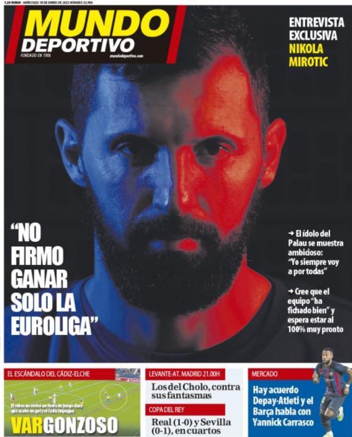 Nikola Mirotic, estrella del Barça de baloncesto, es el protagonista de la portada de Mundo Deportivo, que también dedica espacio al polémico Cádiz-Elche: "El VAR no revisó un fuera de juego que acabó en gol y el Cádiz impugna".