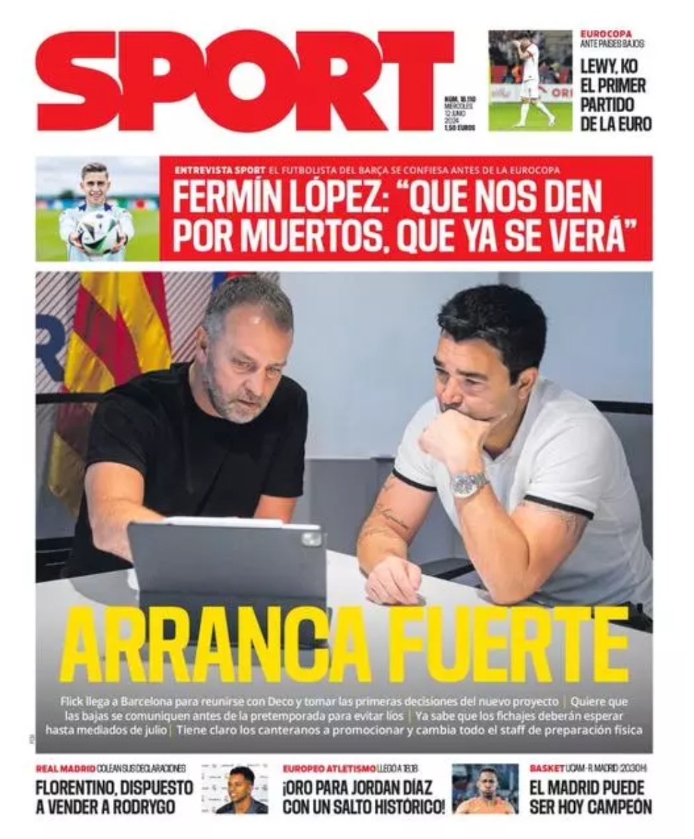 Sport apunta en su portada que "Flick llega a Barcelona para reunirse con Deco y tomar las primeras decisiones del nuevo proyecto. quiere que las bajas se comuniquen antes de la pretemporada para evitar líos. Ya sabe que los fichajes deberán esperar hasta mediados de julio. Tiene claro los canteranos a promocionar y cambia todo el staff de preparación física