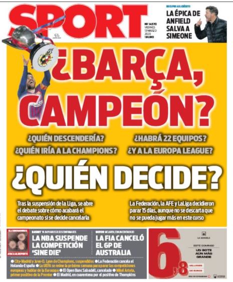 Sport apunta que "tras la suspensión de la Liga, se abre el debate sobre cómo acabará el campeonato si se decide cancelarla. La Federación, la AFE y la Liga decidieron parar quince días, aunque no se descarta que no se pueda jugar más en este curso", apunta el rotativo catalán.