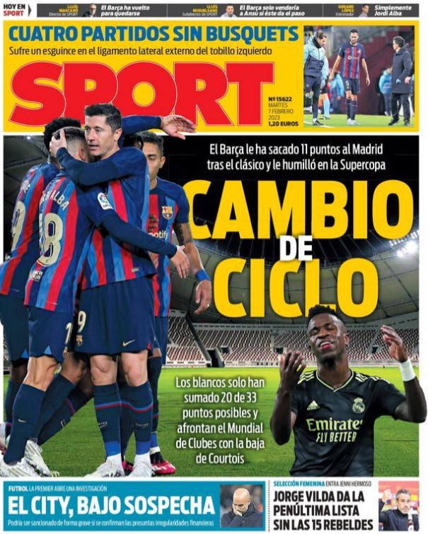 Sport publica en su portada que "el Barça le ha sacado 11 puntos al Madrid tras el Clásico y le humilló en la Supercopa. Los blancos sólo han sumado 20 de 33 puntos posibles y afrontan el Mundial de Clubes con la baja de Courtois".