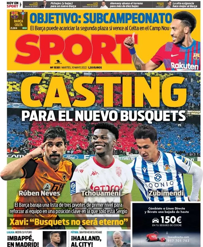Sport apunta que "el Barça baraja una lista de tres pivotes de primer nivel para reforzar al equipo en una posición clave en la que sólo está Sergio Busquets". El rotativo apunta a Rúben Neves, Tchouaméni y Zubimendi.