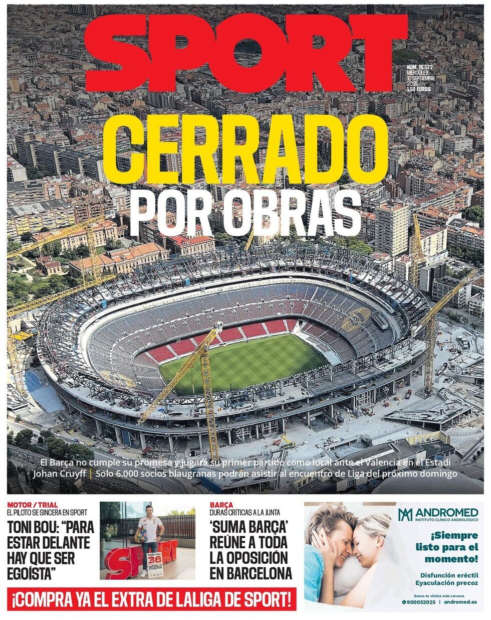 Sport apunta que "el Barça no cumple su promesa y jugará su primer partido como local ante el Valencia en el Estadi Johan Cruyff. Sólo 6.000 socios blaugranas podrán asistir al encuentro de Liga del próximo domingo".