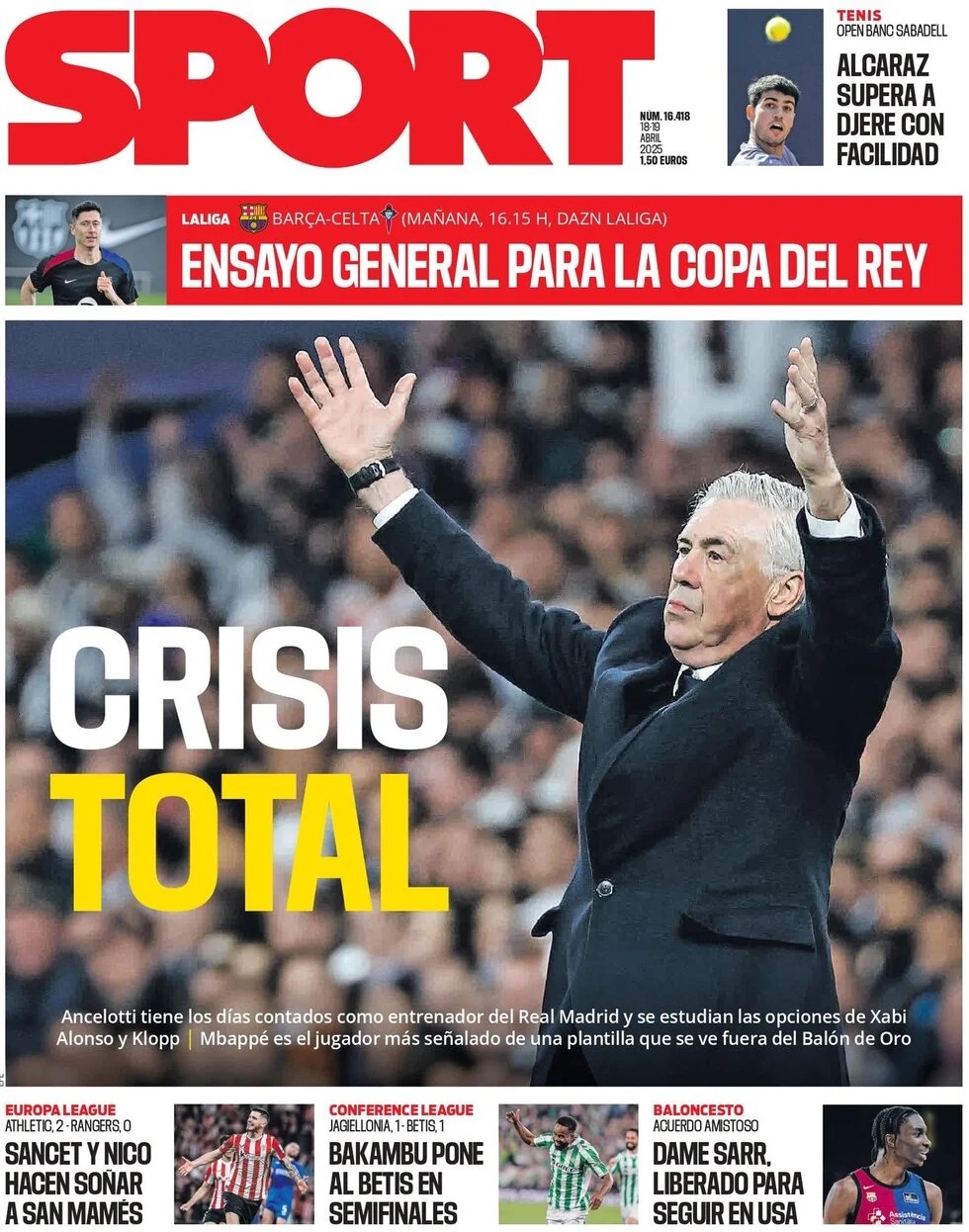 Sport publica que "Ancelotti tiene los días contados como entrenador del Real Madrid y se estudian las opciones de Xabi Alonso y Klopp. Mbappé es el jugador más señalado de una plantilla que se ve fuera de Balón de Oro".