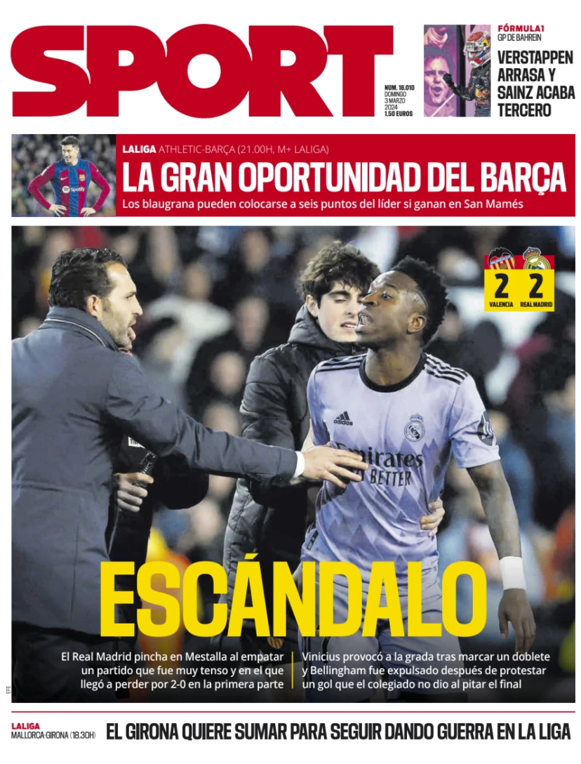 Sport apunta que "el Real Madrid pincha en Mestalla al empatar un partido que fue muy tenso y en el que llegó a perder por 2-0 en la primera parte. Vinícius provocó a la grada tras marcar un doblete y Bellingham fue expulsado después de protestar un gol que el colegiado no dio al pitar el final"
