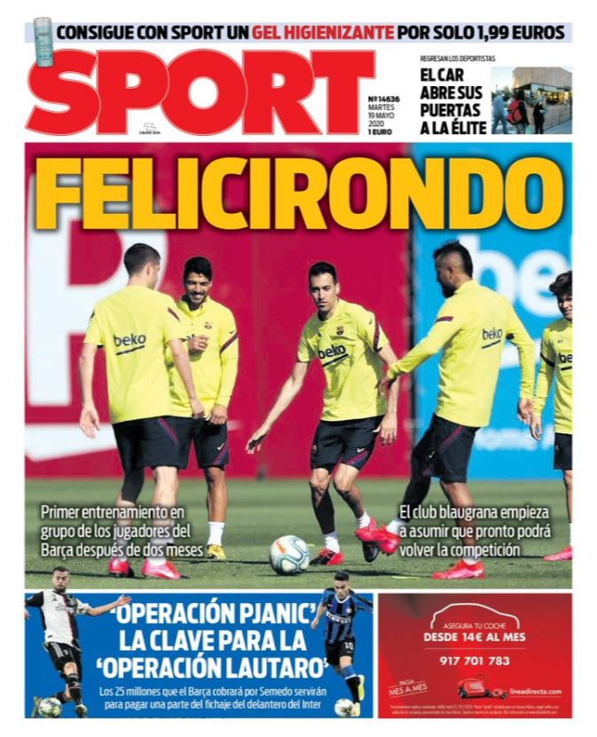 Sport apunta en su portada que el Barça realizó su "primer entrenamiento en grupo después de dos meses. El club blaugrana empieza a asumir que pronto podrá volver a la competición".