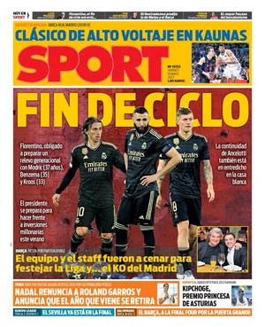 Sport dedica su portada a los resultados insatisfactorios del Real Madrid en la presente temporada: "Florentino, obligado a preparar un relevo generacional con Modric, Benzema y Kroos. El presidente se prepara para hacer frente a inversiones millonarias este verano".