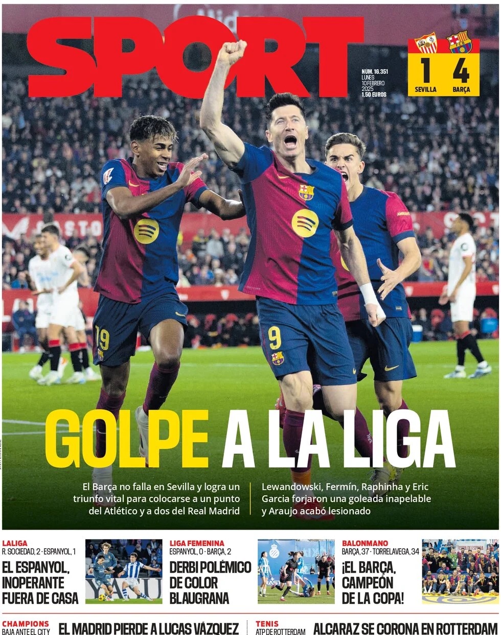 Sport publica que "el Barça no falla en Sevilla y logra un triunfo vital para colocarse a un punto del Atlético y a dos del Real Madrid. Lewandowski, Fermín, Raphinha y Eric García forjaron una goleada inapelable y Araujo acabó lesionado".