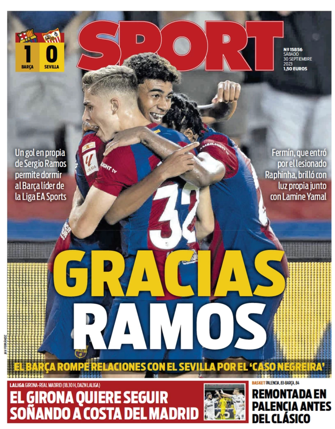 Sport apunta que "un gol en propia puerta de Sergio Ramos permite dormir al Barça líder de la Liga. Fermín, que entró por el lesionado Raphinha, brilló con luz propia junto a Lamine Yamal".