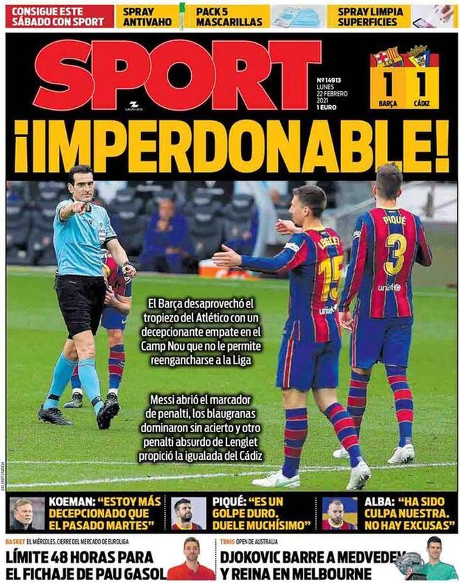 Sport publica en su portada que "el Barça desaprovechó el tropiezo del Atlético con un decepcionante empate en el Camp Nou que no le permite reengancharse a la Liga. Messi abrió el marcador de penatl, los blaugranas dominaron sin acierto y otro penalti absurdo de Lenglet propició la igualada del Cádiz".