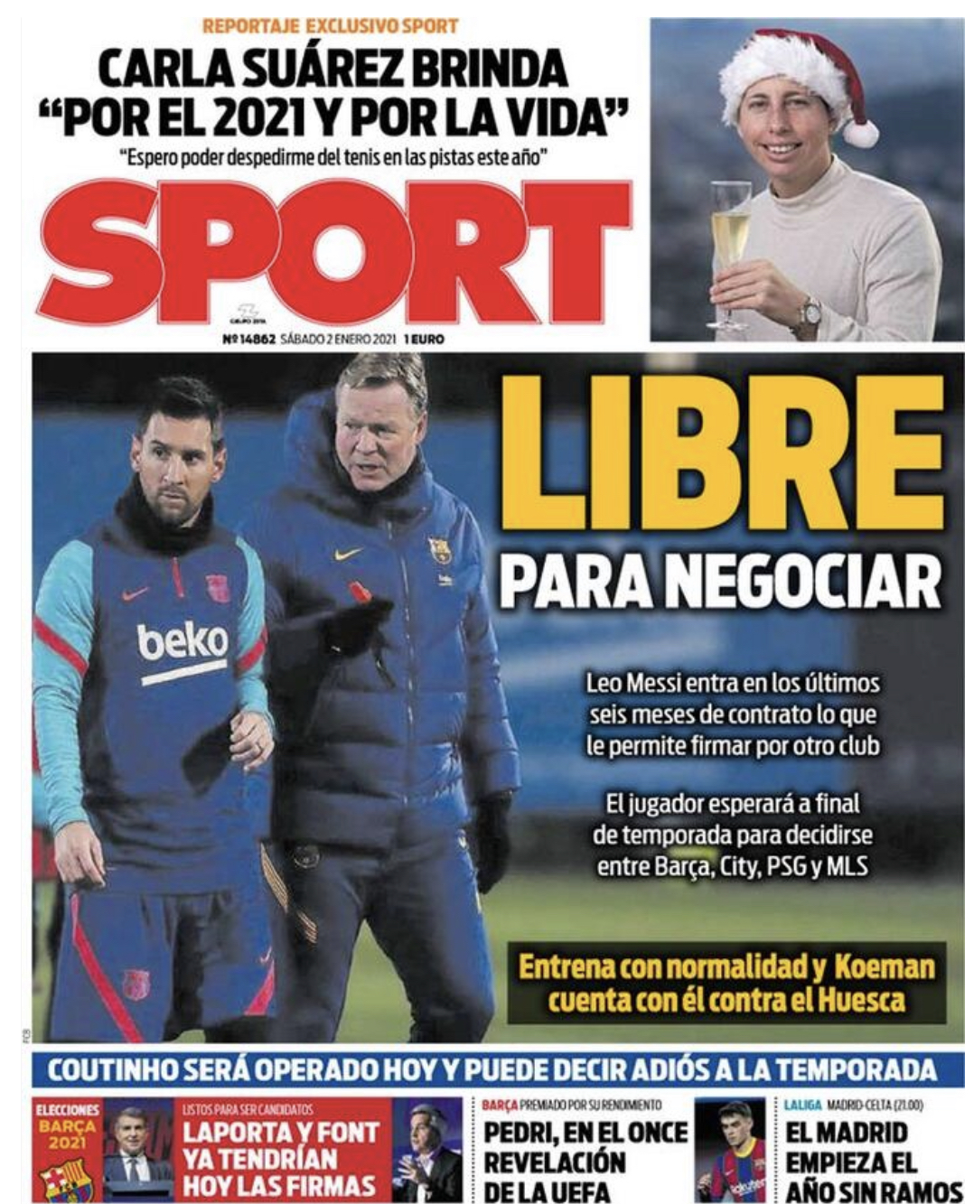 Sport publica en su portada que "Leo Messi entra en los últimos seis meses de contrato, lo que le permite firmar por otro club. El jugador esperará a final de temporada para decidirse entre Barça, City, PSG o MLS".