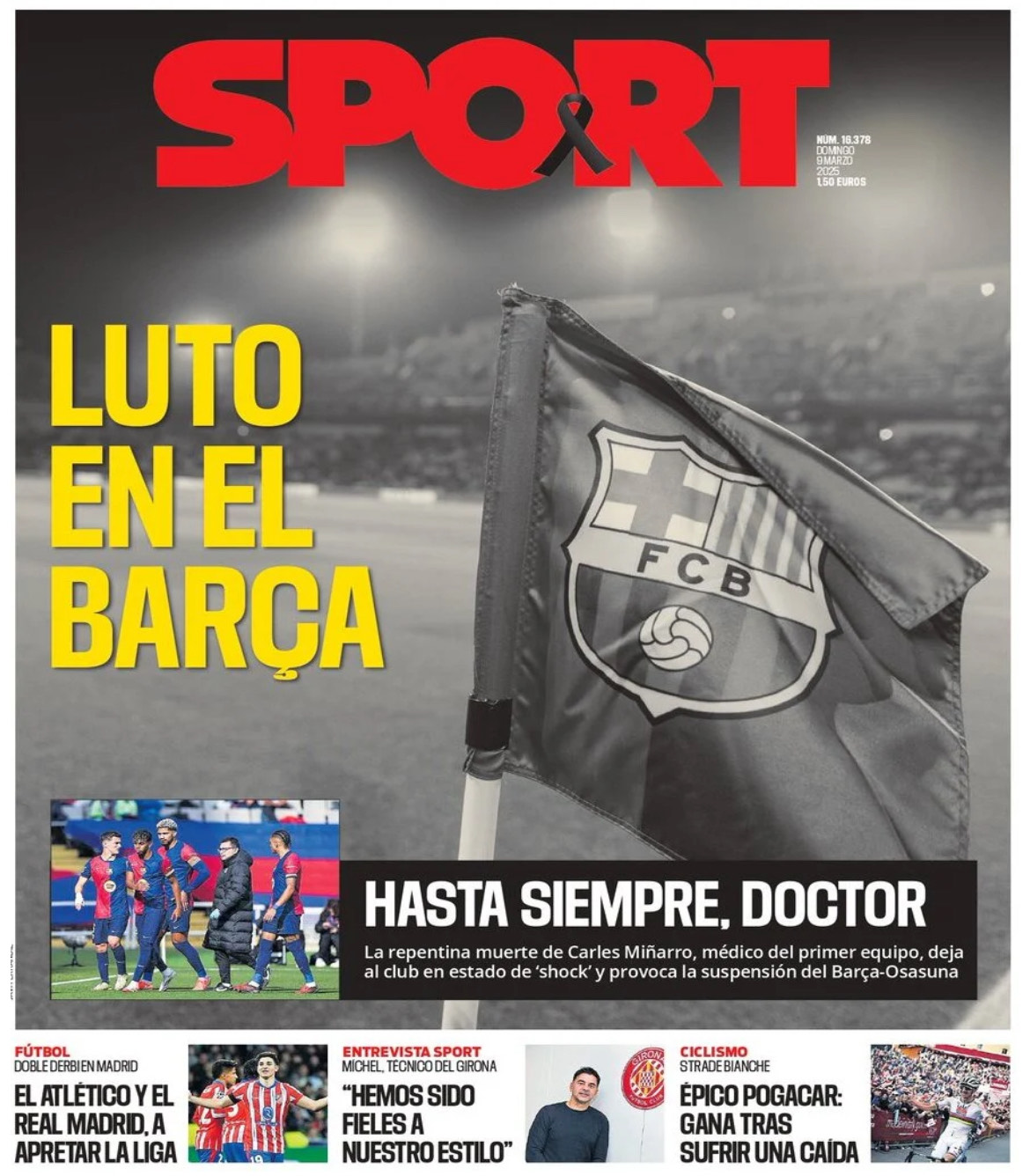 Sport apunta que "la repentina muerte de Carles Miñarro, médico del primer equipo, deja al FC Barcelona en estado de shock y provoca la suspensión del Barça-Osasuna".