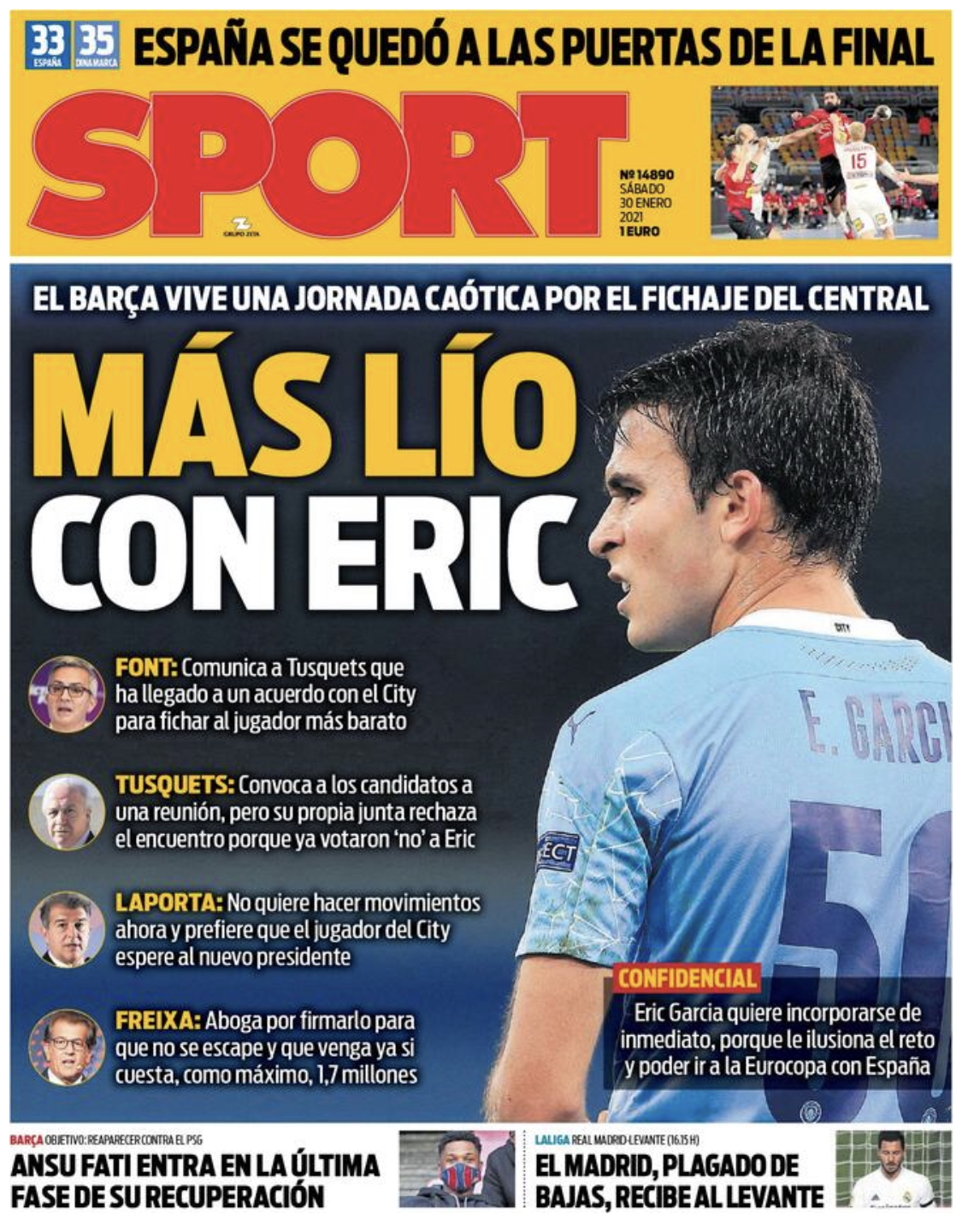 Sport destaca en su portada los últimos acontecimientos en el FC Barcelona en torno a la frustrada llegada de Eric García: "Font comunica a Busquets que ha llegado a un acuerdo con el City para fichar al jugador más barato. Tusquets convoca a los candidatos a una reunión pero su propia Junta rechaza el encuentro porque la votaron 'no' a Eric. Laporta no quiere hacer movimientos ahora y prefiere que el jugador del City espere al nuevo presidente. Freixa aboga por firmarlo para que no se escape y que venga ya si cuesta, como máximo, 1,7 millones".