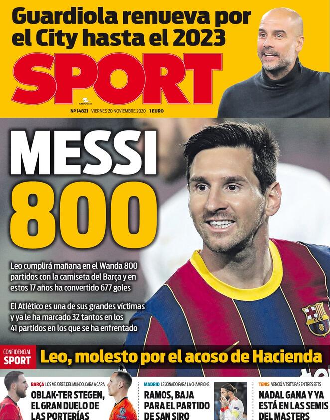 Lionel Messi es protagonista de la portada de Sport: "Leo cumplirá mañana en el Metropolitano 800 partidos con la camiseta del Barça y en estos 17 años ha convertido 677 goles. El Atlético es una de sus grandes víctimas y ya le ha marcado 32 tantos en los 41 partidos en los que se ha enfrentado".